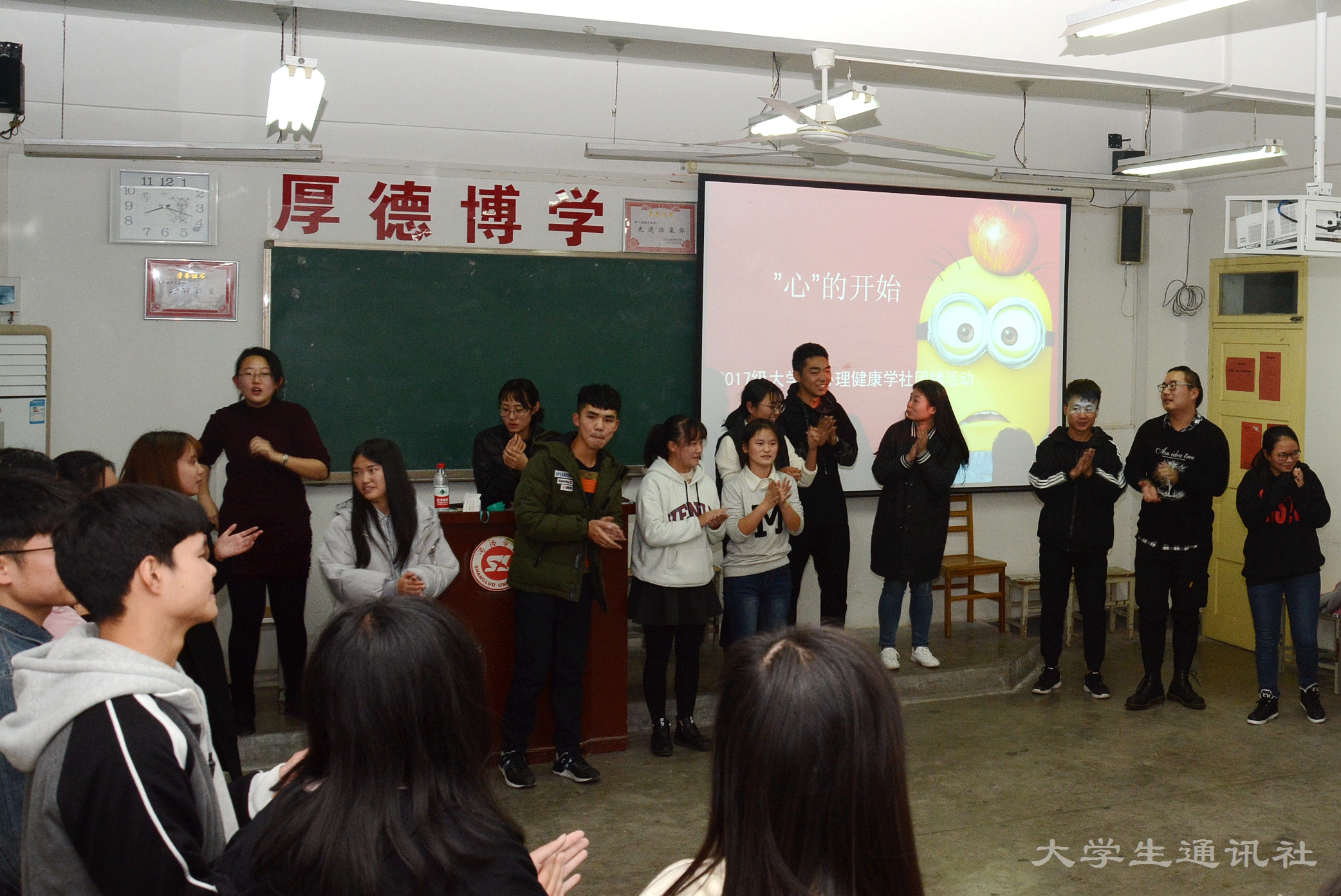 2017年11月27日晚,大学生心理健康学社在一号教学楼305教室开展本学期首次团辅活动。团辅成员主要由我校应用心理学专业学生组成,团辅对象为我校健康管理学院17级新生。活动主题为:“心”的开始。本次团辅活动目的在于积极帮助17级新生建立信心、加强团队协作能力,更好的适应环境,融入集体。