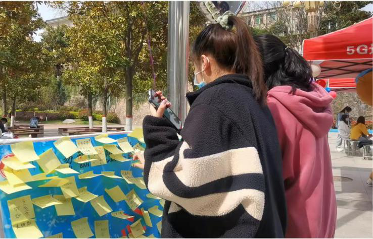 同学们在气球上写下自己在学习、生活中的烦恼和压力,然后用尽全力踩爆气球,在气球的爆破声中,烦恼也在那一瞬间消失不见!紧接着,同学们在便签上写下自己的心愿或对未来的祝福,将它们贴在“为我打CALL”心愿墙上。