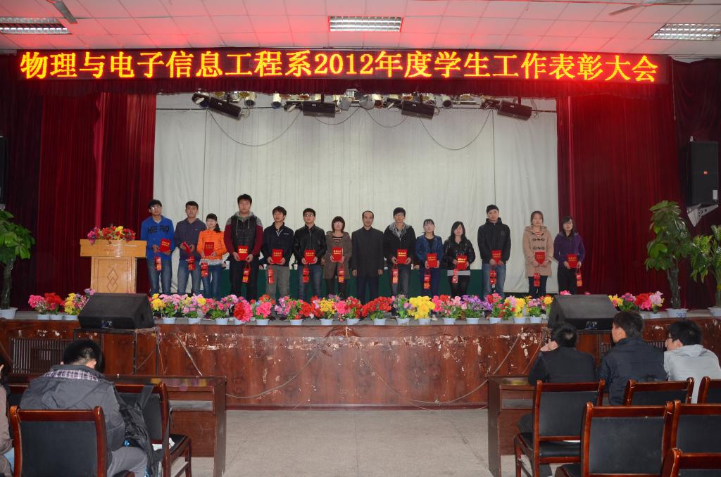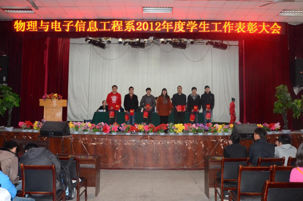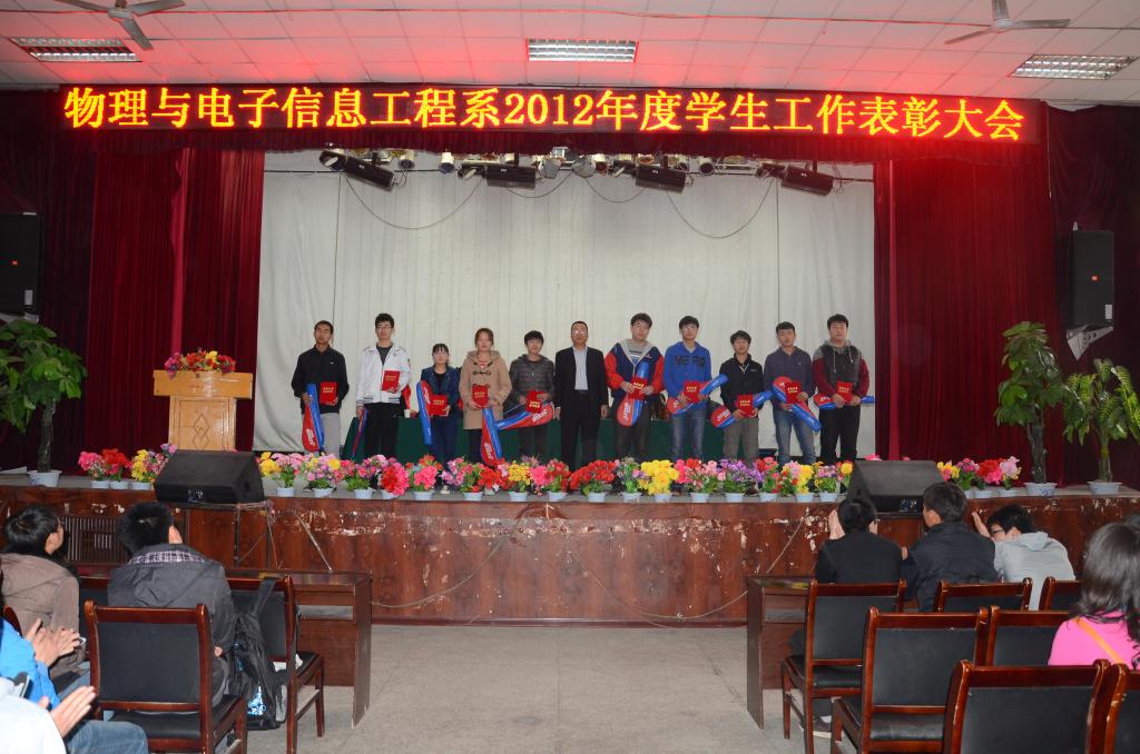 为树立典型,鼓励先进,3月6日下午,物理与电子信息工程系在大学生活动中心召开了2012年度学生工作表彰大会,物理与电子信息工程系主任刘宝盈、系党总支书记张秦中、系副主任李英等领导和全体老师出席会议,500余名学生代表参加,会议由团总支书记陈倩主持。